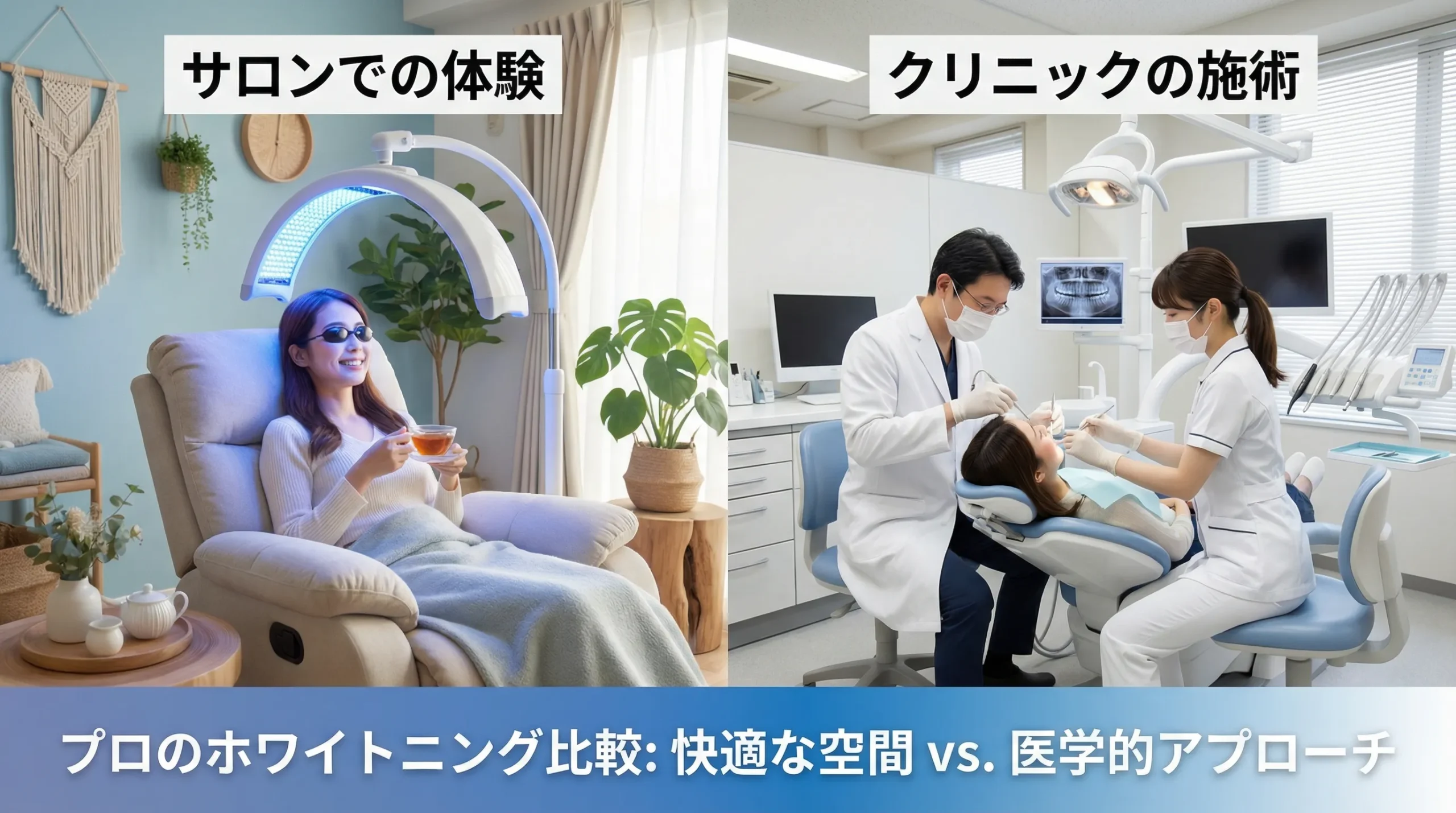 サロンで使われる主な薬剤は過酸化水素。これは歯科医院で漂白に使う成分と同じで、安全な濃度管理のもとで使用します。ホワイトニング専用ライト(LEDライト)を照射することで、薬剤の効果をさらに高めるのが特徴です。また、歯科での漂白と比べ、負担や痛みが極めて少ないのもサロン型ホワイトニングの利点といえます。